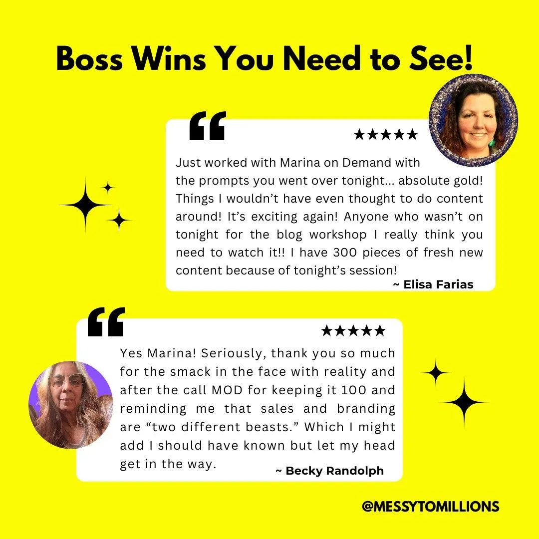 That’s exactly what Marina on Demand was designed for. It doesn’t add pressure - it removes it. It’s your backup brain, content coach, and confidence boost… all in one spot. Instead of staring at a blank screen or ghosting your audience again, you open the bot, type in what you need, and get magic back in seconds. You’ll wonder how you ever marketed without it.